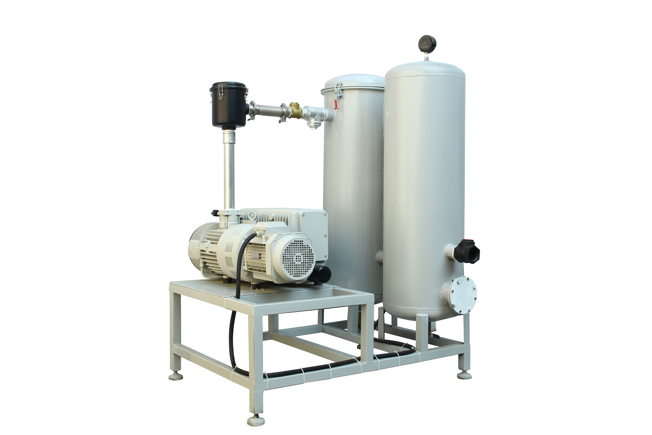 固定式系統一般包括底盤基座、真空泵、真空緩沖罐、控制箱、真空附件(真空閥、真空管道真空過濾器等)、真空度控制系統組成,一般適合抽氣量大,工作條件苛刻等工況例如;3立方真空負壓站,配置2臺302立方真空泵,真空過濾器組,在自動控制模式下瞬間抽氣速度可達上干立方每小時時,遠大于單泵和雙泵直接抽氣的速度。